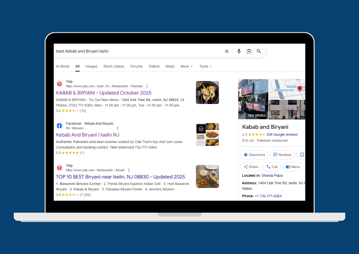 For this restaurant brand, we developed a complete local SEO strategy—optimizing Google Business Profile, citations, and local keywords. The restaurant now ranks in the top search results for “biryani near me” and similar local food searches, resulting in consistent foot traffic and online orders. We also built a strong review-generation system and implemented schema markup, boosting visibility and credibility among local customers searching for authentic South Asian cuisine.